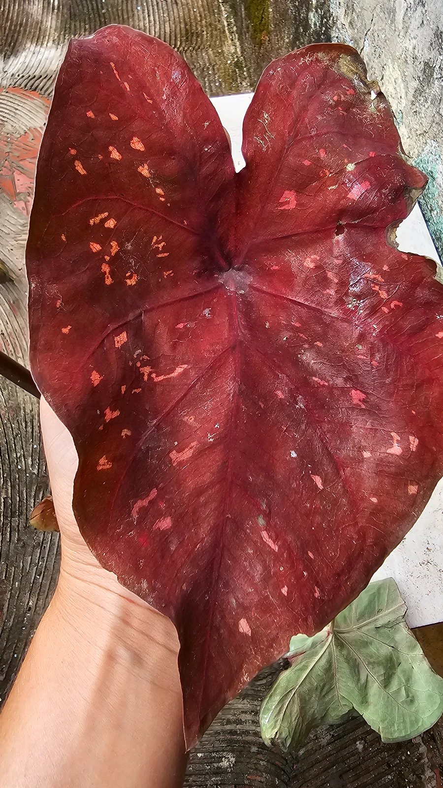 Caladium Vermelho Exuberante: folha grande e cor vibrante de tom rubi com manchas rosadas, garante impacto imediato em qualquer ambiente. Ideal para interiores com luz indireta, proporciona toque tropical e sofisticado. Requer solo bem drenado, regas moderadas e boa umidade para manter as folhas bonitas. Perfeito em vasos ou jardins verticais, para quem busca verde com personalidade.