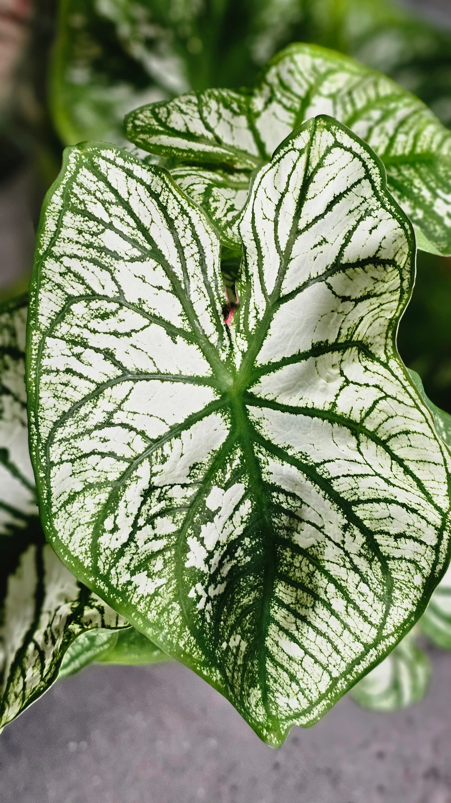 Caladium Branco com Veias Verdes — folhagem ornamental com centro branco e veias verdes que se destacam, criando um efeito luminoso no ambiente. Ideal para salas, varandas e vasos, trazendo toque tropical e elegância à decoração. Fácil de cuidar: luz indireta, solo bem drenado e regas moderadas. Perfeita para quem busca cor marcante com manutenção simples.