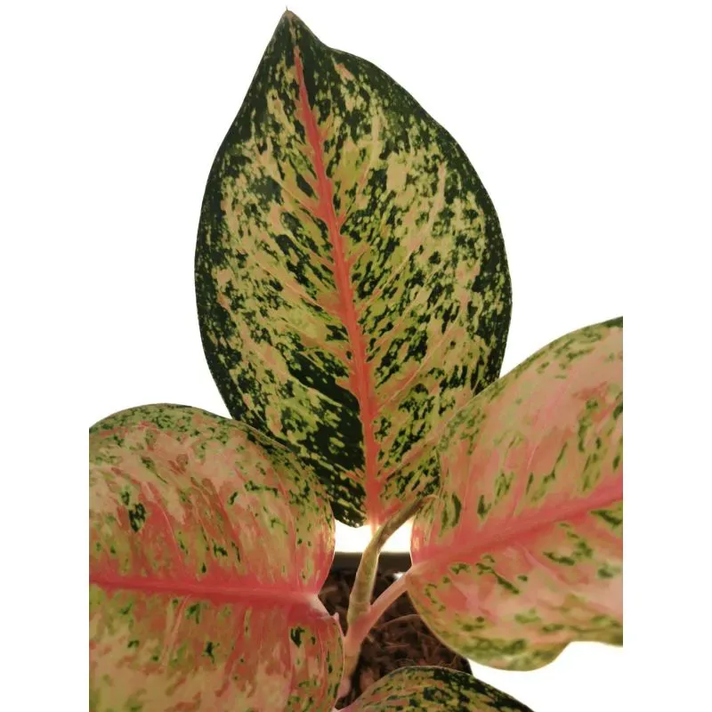 Caladium Dalmatian Rosa: planta de folhagem tropical com folhas verde-claras manchadas de rosa e caules rosados. Perfeita para interiores, em vasos decorativos revela cores vibrantes em salas, quartos ou escritórios. Benefícios: toque exótico e visual iluminado, ideal para quem busca destaque. Cuidados simples: luz indireta, regas moderadas e solo bem drenado. Excelente para decorar ou presentear.